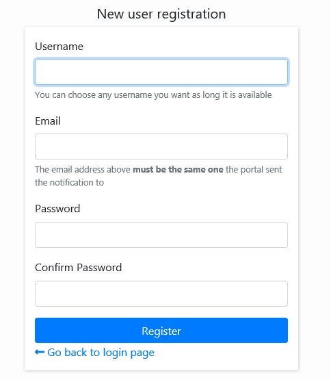 On the new user screen, enter a username of your choosing. Enter the email address to which the email with the link was sent. Type in a password and confirm the password. Then press register.